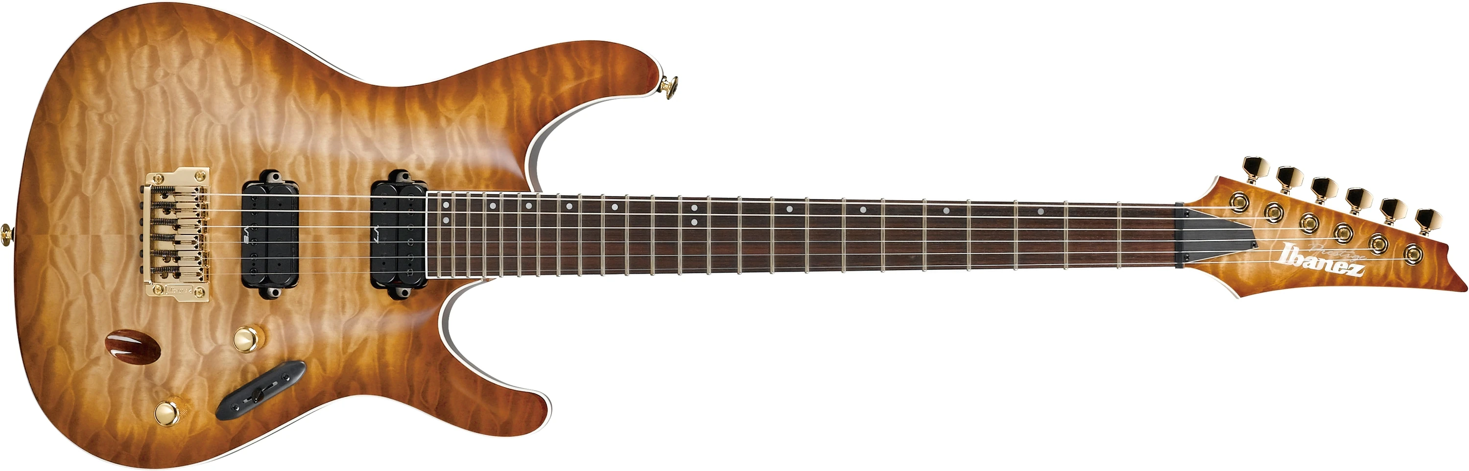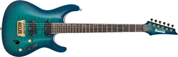 The S5521Q features a quilted maple top on a mahogany body bolted to a titanium reinforced Super Wizard HP maple and walnut neck with a 24-fret rosewood fingerboard with binding and offset dot position markers. Components include dual Ibanez Vintage humbucking pickups, a Gibraltar Standard II fixed bridge, a Graph Tech nut and Gotoh locking tuning machines.