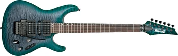 The S5570Q features a quilted maple top on a mahogany body bolted to a titanium reinforced maple and walnut Super Wizard HP neck with a 24-fret rosewood fingerboard with offset white dot position markers. Components include Ibanez pickups with a pair of Hot Grinder humbuckers flanking a Short Tracer single-coil, a Lo-Pro Edge double locking tremolo bridge, a locking nut and Gotoh tuning machines.