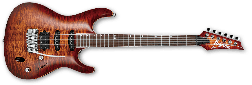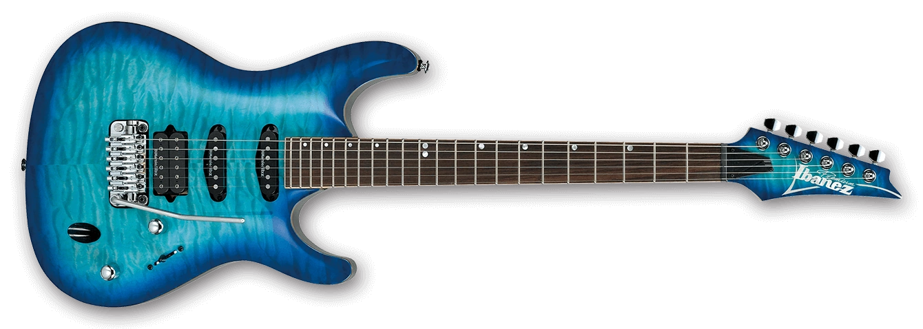 The SA960QM features a quilted maple top with binding on a mahogany body bolted to a maple and walnut neck with a 22-fret rosewood fingerboard with binding and offset dot position markers. It comes equipped with DiMarzio/Ibanez pickups with a humbucker at the bridge and single-coils at the neck and middle positions, a SynchroniZR non-locking synchronized tremolo bridge with a removable ZPS tuning stabilizer, recessed control knobs and a Graph Tech Black TUSQ XL nut.