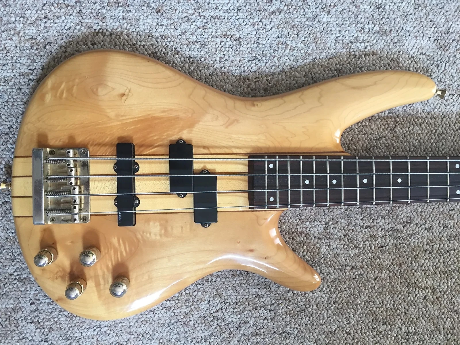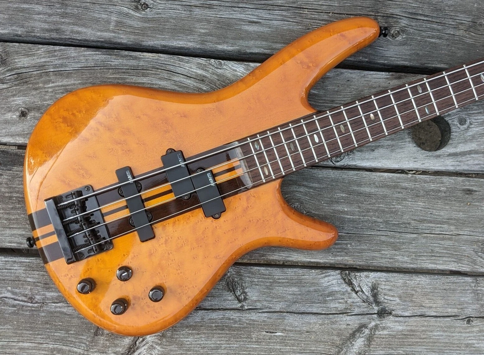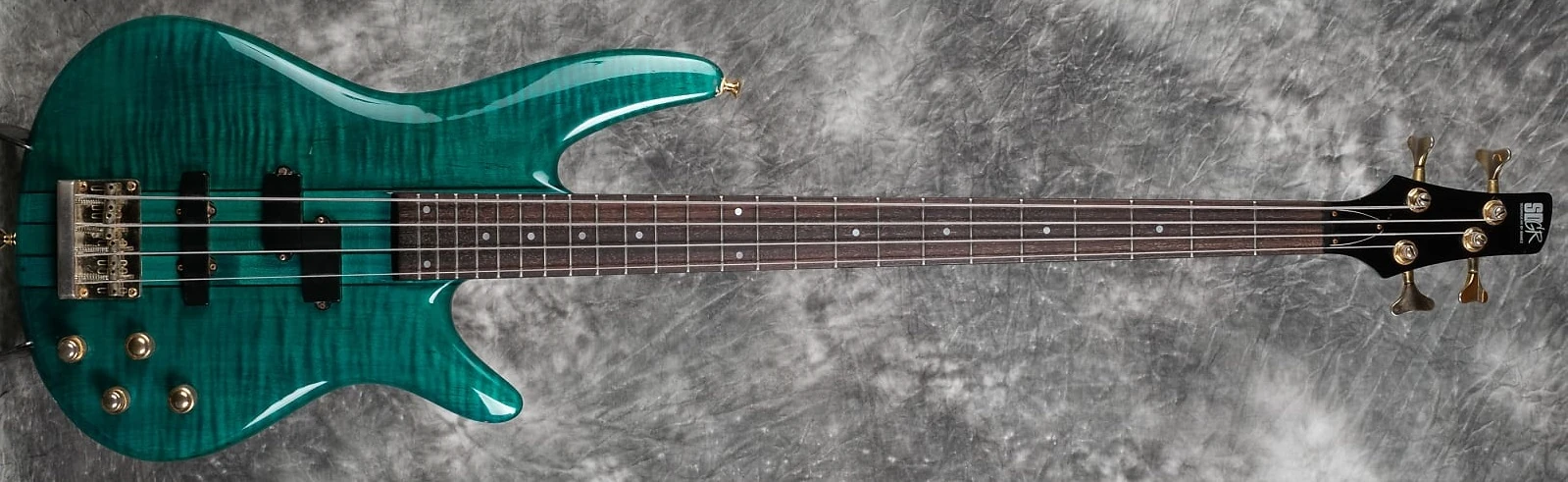 The SR1200 features neck-through-body construction on mapel and figured maple top attached to a maple and walnut neck with a 24-fret rosewood fingerboard with pearl dot position markers. Components include an Die-cast 4 string fixed bridge with 19mm string spacing, and a pair of ADX P/J (active dynamix) pickup's channeled through a Vari-Mid 3-Band EQ, a plastic nut and die-casth tuning machines.