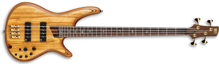 The SR1200 features an ovangkol top on a double-cutaway mahogany body bolted to a titanium reinforced wenge and bubinga Atlas neck with a 24-fret rosewood fingerboard with abalone oval position markers. Components include a pair of Nordstrand Big Single passive pickups with an Ibanez custom preamp with a three-band EQ, individually mounted Mono-rail IV bridges with 19mm string spacing, a GraphTech Black TUSQ nut and Gotoh tuning machines.