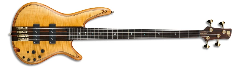 The SR1400T features neck through body construction with a figured maple top on a mahogany wings attached to a titanium reinforced wenge and bubinga neck with a 24-fret rosewood fingerboard with binding and oval abalone position markers. Components include a pair of Nordstrand Big Single passive pickups with an Ibanez custom preamp with a three-band EQ, a Mono-rail IV bridge with 19mm string spacing, a GraphTech Black TUSQ nut and Gotoh tuning machines.