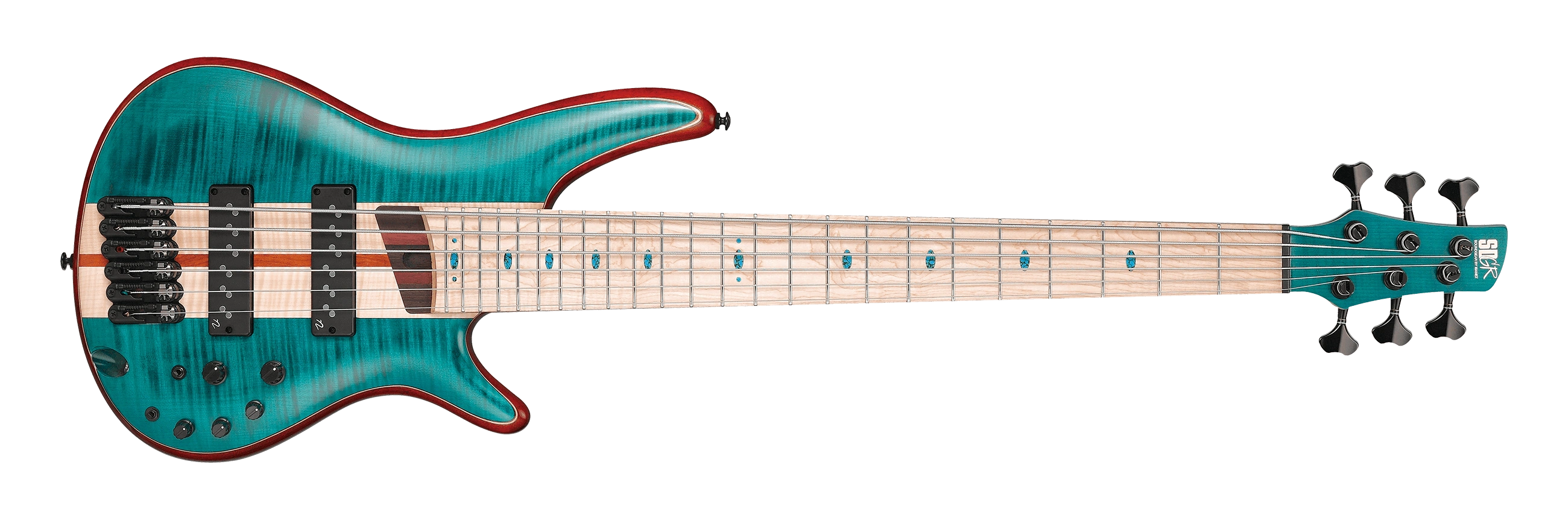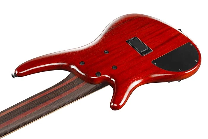 The SR1426B features a flamed maple top with a panga panga strip down the center on a double-cutaway African mahogany body bolted to a titanium reinforced panga panga and purple heart Atlas neck with a 24-fret flamed maple fingerboard with blue oval position markers. Components include a pair of Nordstrand Big Break passive pickups with an Ibanez custom preamp with a three-band EQ, individually mounted Mono-rail VS bridges with adjustable 16.5mm string spacing, a GraphTech Black TUSQ nut, and Gotoh tuning machines.