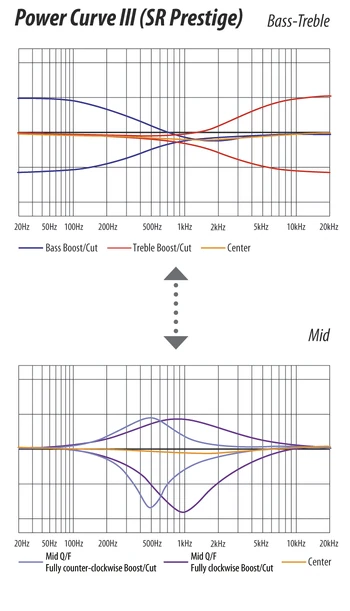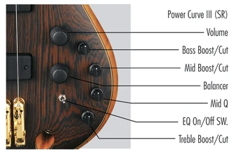 Controls consist of a single volume; a balancer; a 3-band EQ allowing individual boost or cut of up to ±12dB for treble, midrange, and bass; a Mid-Q control to adjust the midrange crossover points; and a toggle to bypass the preamp and send the signal from the pickups directly to the ¼" output.