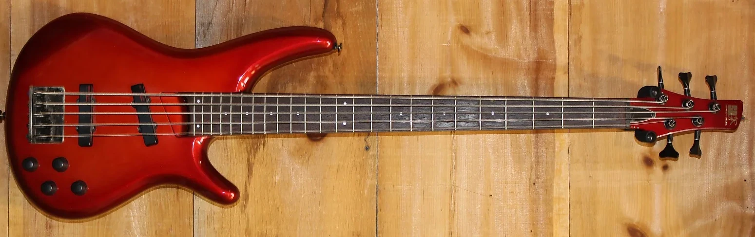 The SR885LE features a double-cutaway basswood body with arched top bolted to a laminated SR5 maple neck with a 24-fret rosewood fingerboard with pearl dot position markers and a matching headstock. Components include a special 5-strings fixed bridge with 16.5mm string spacing, and two Ibanez LO-Z (regulated) active pickup's channeled through a EQ BⅡ 2-band, a plastic nut and Gotoh tuning machines.