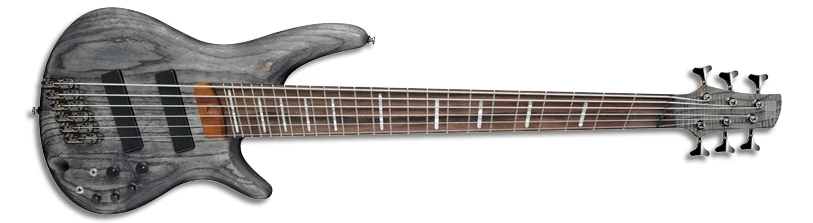 The SRFF806 features a double-cutaway ash body bolted to a jatoba and bubinga neck with a rosewood fingerboard with 24 fanned frets and block position markers. Features include a pair of Bartolini BH1 soapbar pickups, separate Monorail V bridges with 16.5mm string spacing, an Ibanez Custom Electronics 3-band EQ with bypass, and die-cast tuners.