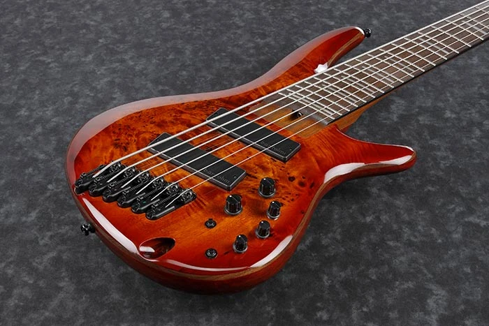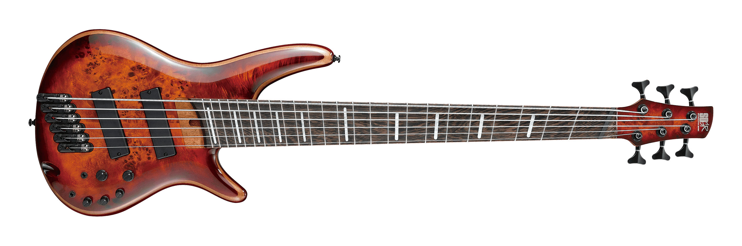 The SRMS806 features a poplar burl top on a double-cutaway walnut and mahogany body bolted to a jatoba and walnut multi-scale neck with a 24-fret panga panga fingerboard with offset stadium position markers. Components include a pair of Bartolini BH2 passive pickups channeled to an Ibanez custom preamp with a three-band EQ, individually mounted Mono-rail 5S bridges with adjustable 16.5mm string spacing, a plastic nut, and Ibanez tuning machines.