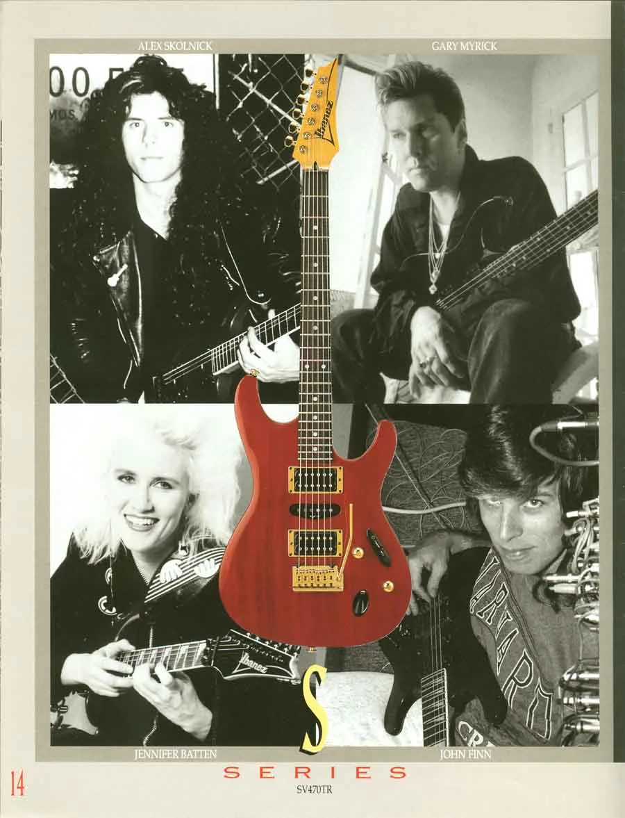 The SV guitar models are based on the S series, and have a similar heavily heavily sculpted, thin mahogany body. What sets the SV models apart is their non-locking synchronized tremolos — regular S series models mostly feature Floyd Rose-style double locking tremolos. The particular trems offered in the SV line range from the TZ-30 in the early days to today's SynchroniZR.