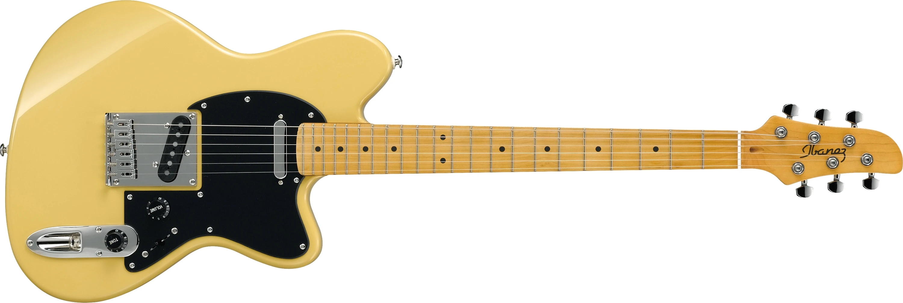 The TM302BM features an alder body bolted to a maple neck with a 22-fret maple fingerboard with black dot position markers. Components include a Telecaster-style IFX10 fixed bridge with six independent saddls, dual Ibanez Custom Vintage single coil pickups mounted in a black pickguard, a bone nut and locking tuners.