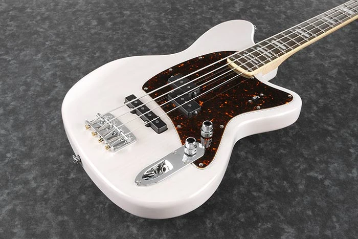 The TMB2000 features an asymmetric double-cutaway ash body bolted to a maple neck with a 20-fret rosewood fingerboard with binding and acrylic block position markers. Components include a pair of custom Nordstrand passive pickups mounted in a tortoise pickguard with a Jazz pickup at the bridge and a Precision pickup at the neck, an Ibanez custom preamp with a bypassable two-band EQ, a Gotoh bridge with 19mm string spacing, a plastic nut and Gotoh tuning machines.