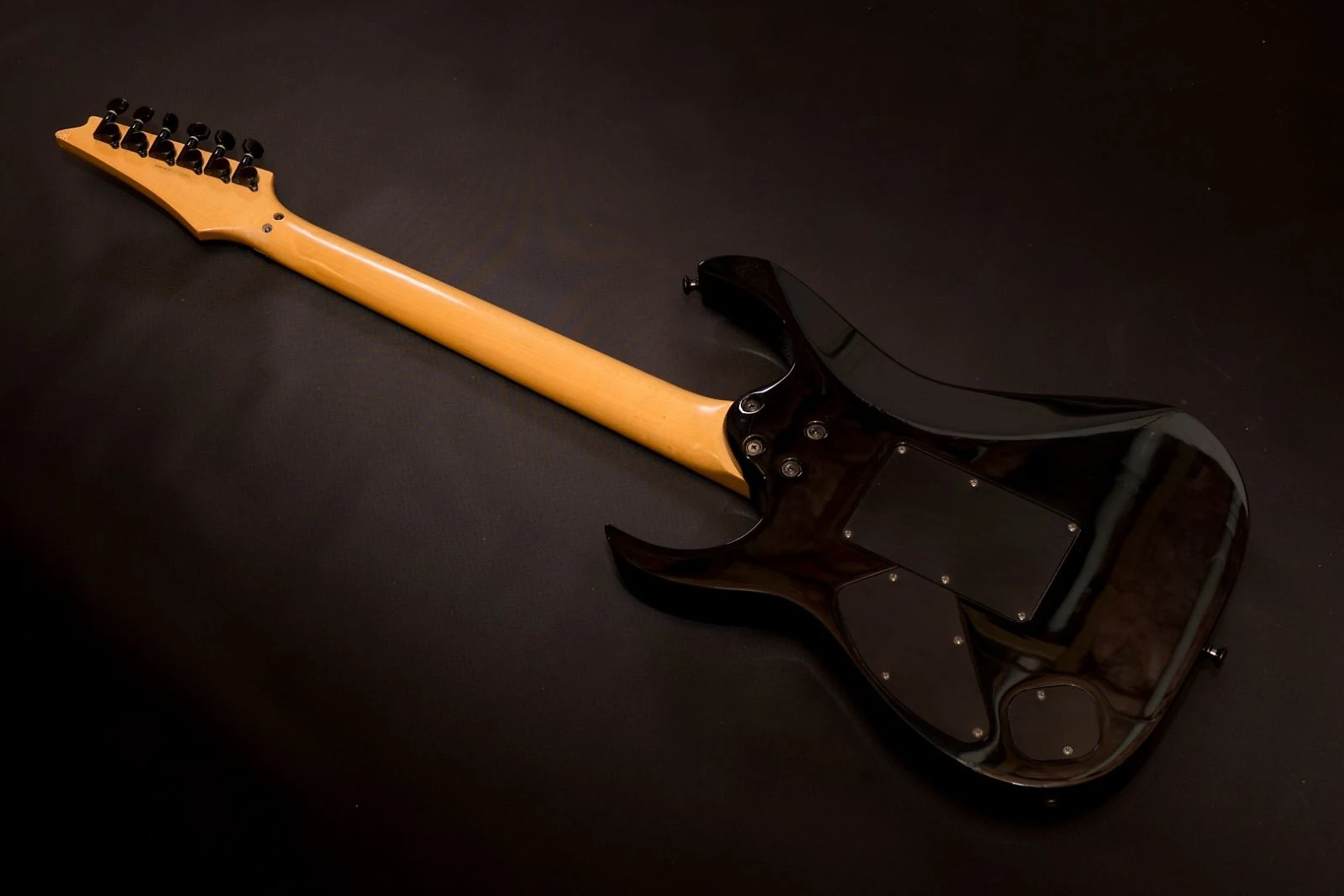 The UCGR12 features a basswood body bolted to a maple neck with a 24-fret maple fingerboard with dot position markers. Components include green DiMarzio made IBZ/USA pickups with an F2 humbucker at the bridge and C2 single-coils at the neck and middle positions, an Edge double locking tremolo bridge, a locking nut and Gotoh tuning machines.