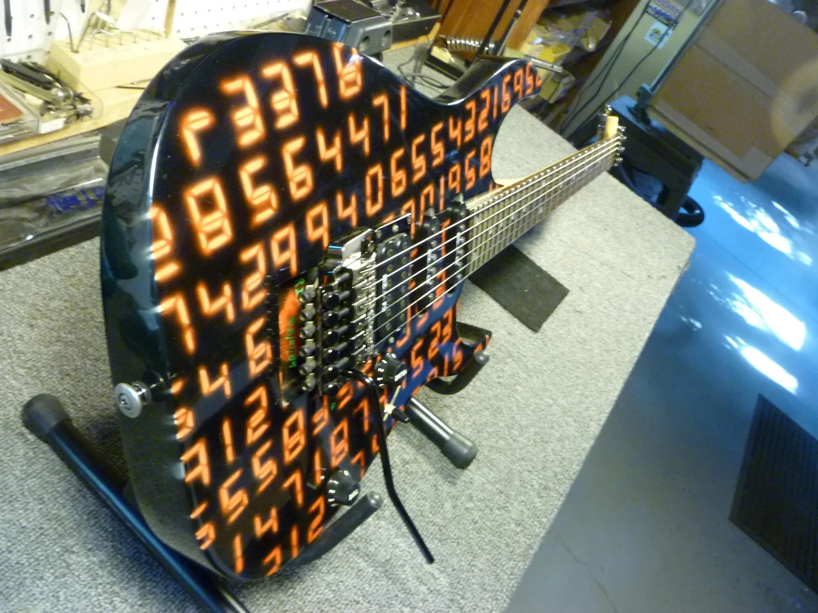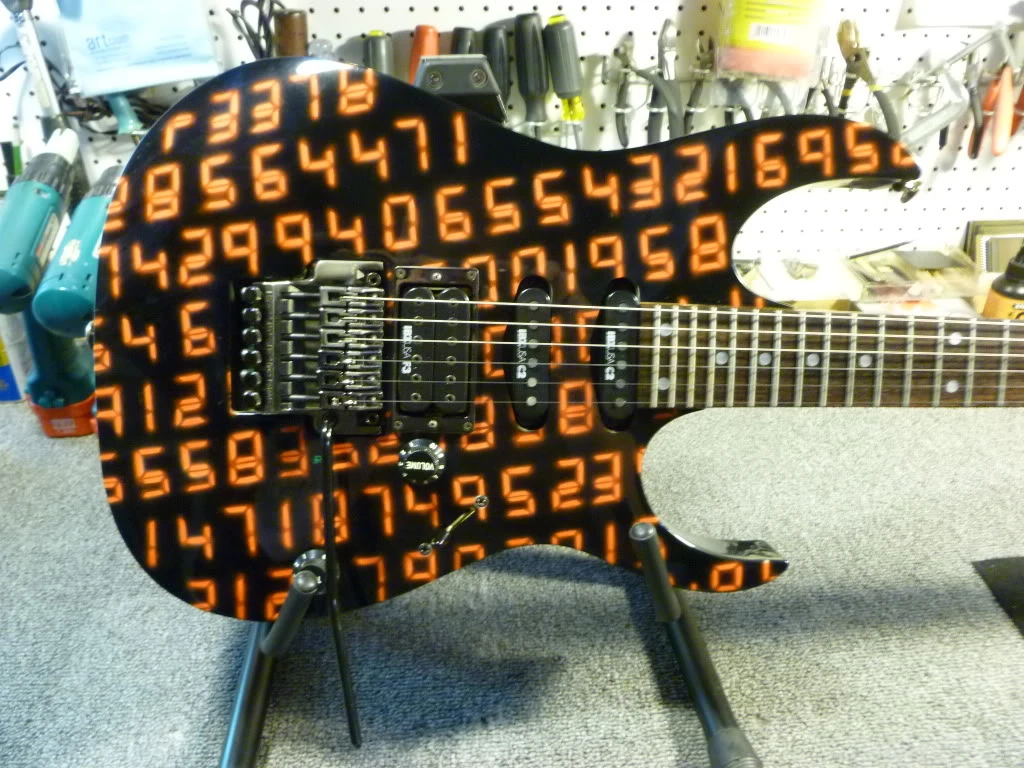 The image on this guitar, entitled "UCGR Digital Madness" features a black background with red numbers in a digital style on the top of the guitar. It was handpainted and signed by Artist: Rick Klemann.