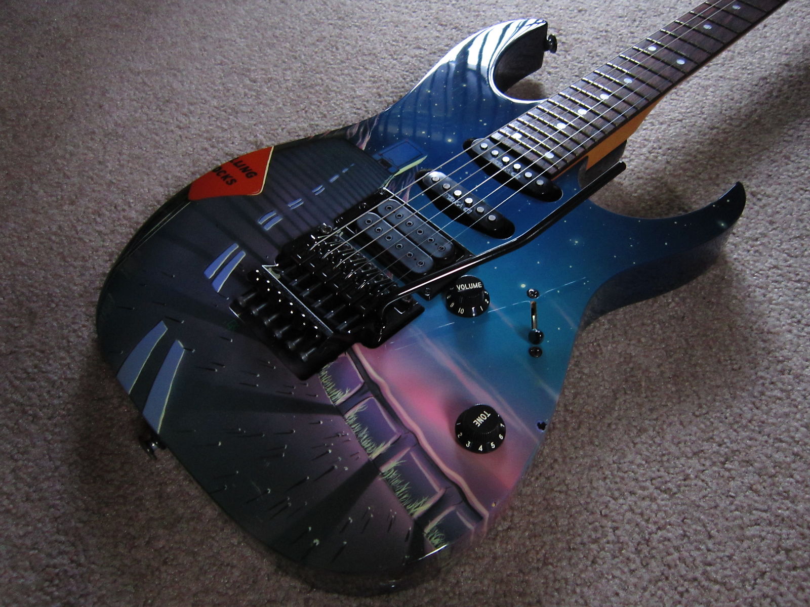 The UCGR Road Song is an RG series solid body electric guitar model introduced by Ibanez in 1989. It was produced in the United States as part of the Graphic Design series of the USA Custom line. The Graphic Design models feature bodies which are handpainted by "some of the most skilled and imaginative artists in America".[1]