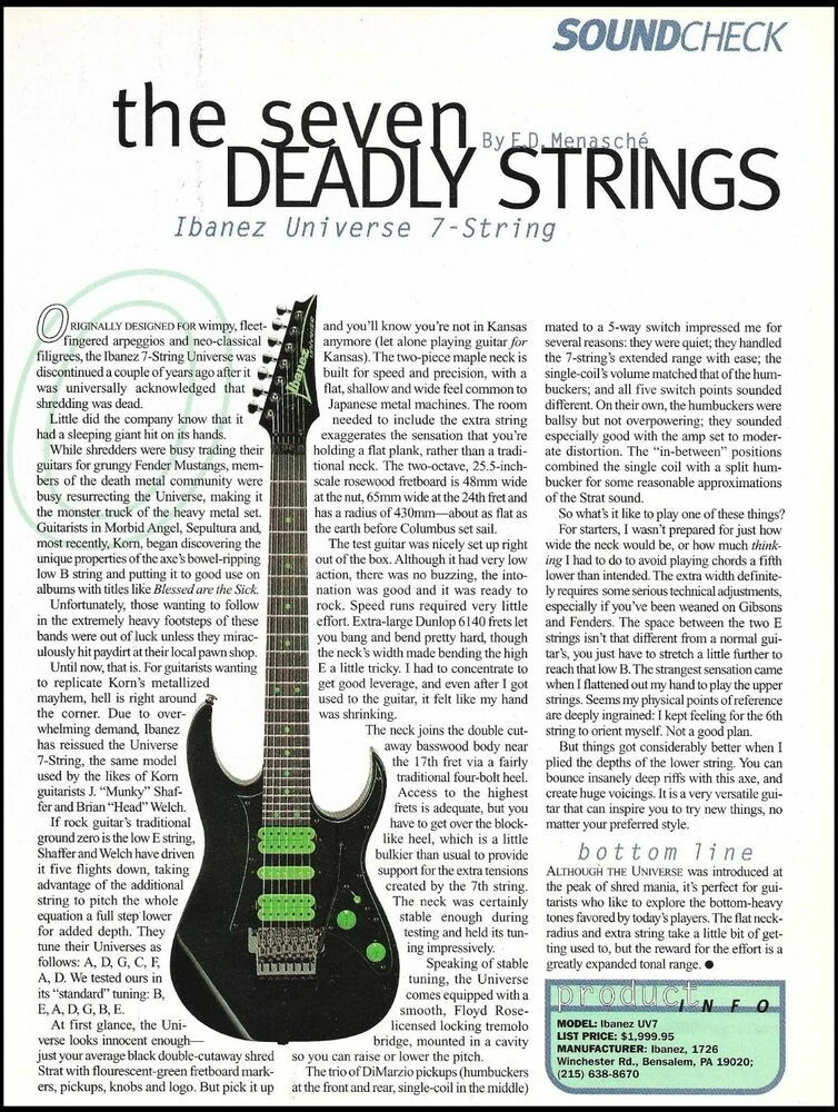 The UV7 is a seven string Universe series solid body electric guitar introduced by Ibanez in 1990. It is a signature model of American guitarist Steve Vai. It was made in Japan by FujiGen. It is also referred to as the green dot Universe due to its green fretboard inlays.