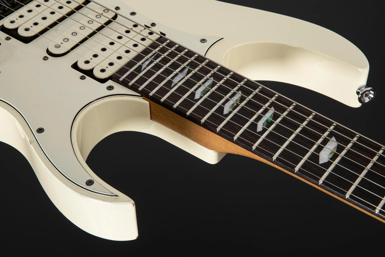 The UV7P features an American basswood body bolted to a maple neck with a 24-fret rosewood fingerboard with pearl and abalone disappearing pyramid position markers. Components include white DiMarzio Blaze II pickups mounted in a white pearloid pickguard with a pair of humbuckers flanking a single-coil, a double locking tremolo tremolo bridge, Gotoh tuning machines and white top hat knobs.